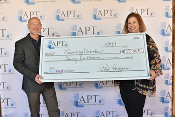 Survivor expert, Les Stroud, CEO of Les Stroud Productions, and Amy Shumaker, Associate General Manager for Content at Fort Myers' WGCU, hold their check for $75,000 awarded at APT PitchFest Live 2019! for their planned fundraising production Surviving Disaster.